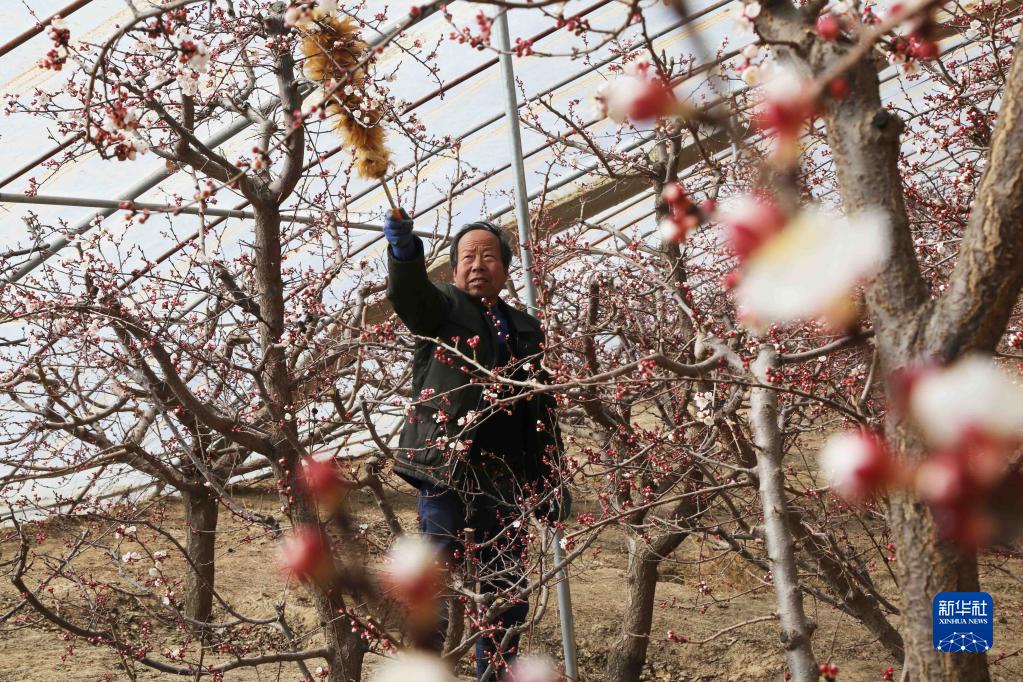 2月25日,甘肅省定西市安定區鳳翔鎮村民給杏花人工授粉。