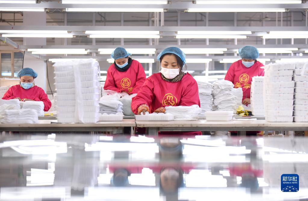 2月23日,在山東省淄博市沂源縣南麻街道賈家莊村一巾被生產企業,就近就業的村民在車間包裝線上忙碌。