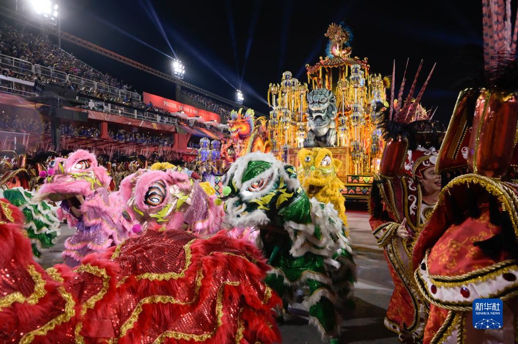 2月21日凌晨,在巴西里約熱內盧桑巴大道,一輛以中國文化為主題的桑巴舞校花車參加狂歡節游行。