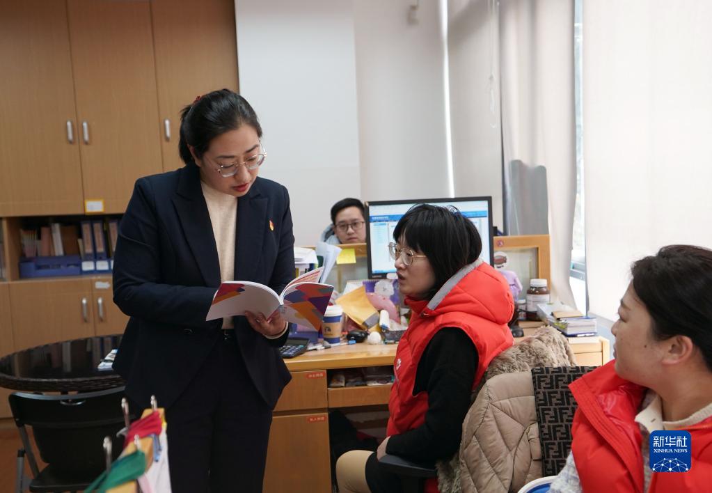 2月16日,在上海虹橋街道榮華居委會,盛弘(左一)和同事交流活動籌備情況。新華社記者 劉穎 攝