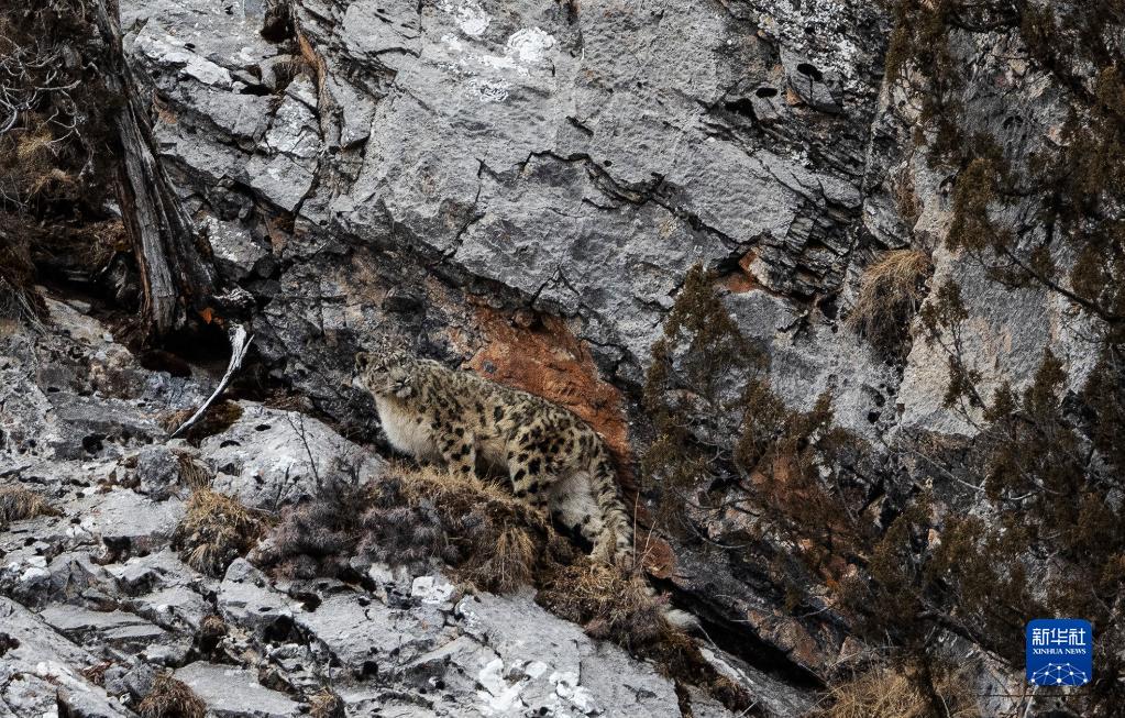 2月21日,在青海省玉樹藏族自治州雜多縣昂賽鄉境內的昂賽大峽谷內,一只雪豹準備向上攀爬。