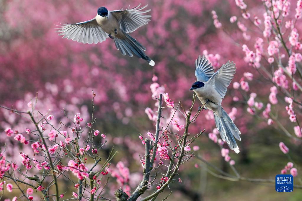 2月21日,灰喜鵲在江蘇揚州瘦西湖“湖上梅林”中翩飛起舞。