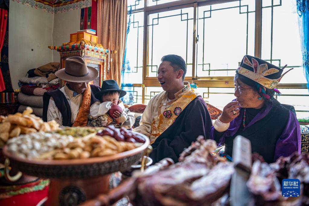 2月20日,在位于西藏拉薩市墨竹工卡縣門巴鄉的家中,扎西次仁(左一)一家在聊天、享用美食。