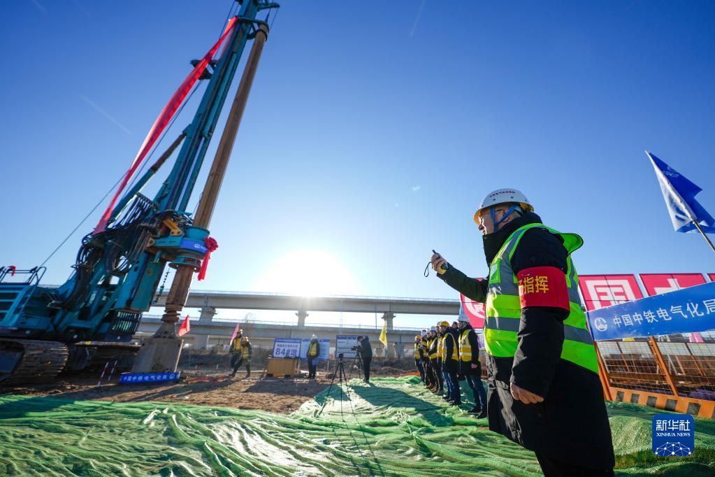2月25日,中鐵電氣化局的施工人員在雄忻高鐵新蓋房特大橋建設現(xiàn)場指揮鉆孔作業(yè)。