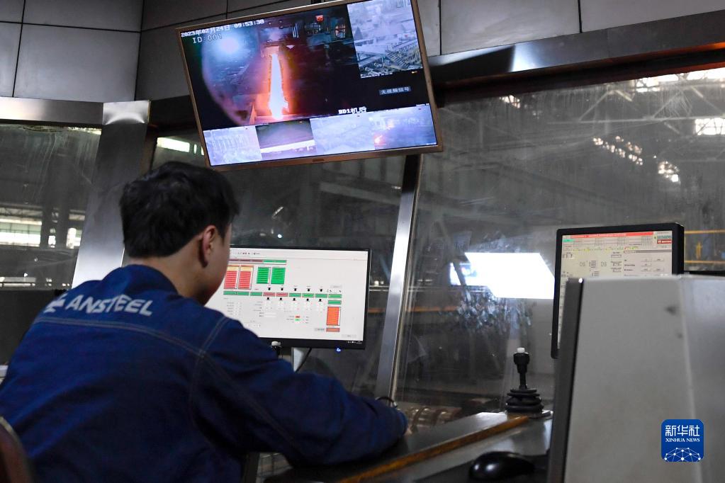 在攀鋼釩軌梁廠一軋機(jī)控制室內(nèi),軋鋼工關(guān)注軋機(jī)進(jìn)出鋼狀態(tài)(2月24日攝)。