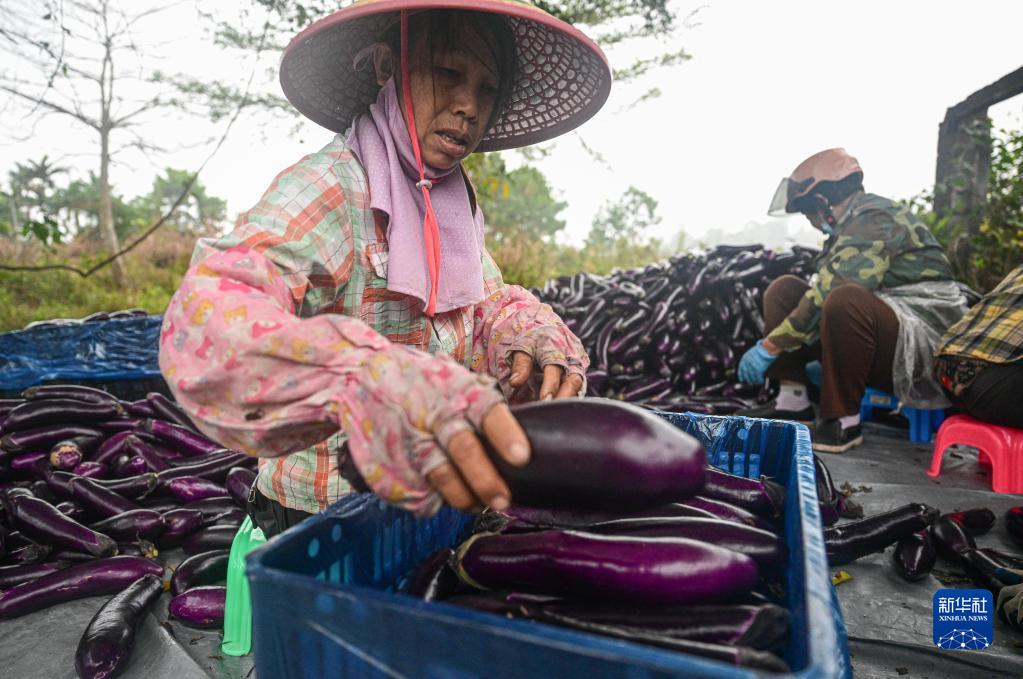 農(nóng)戶在海南省屯昌縣坡心鎮(zhèn)一處農(nóng)田邊分揀、打包采收的茄子(2月14日攝)。