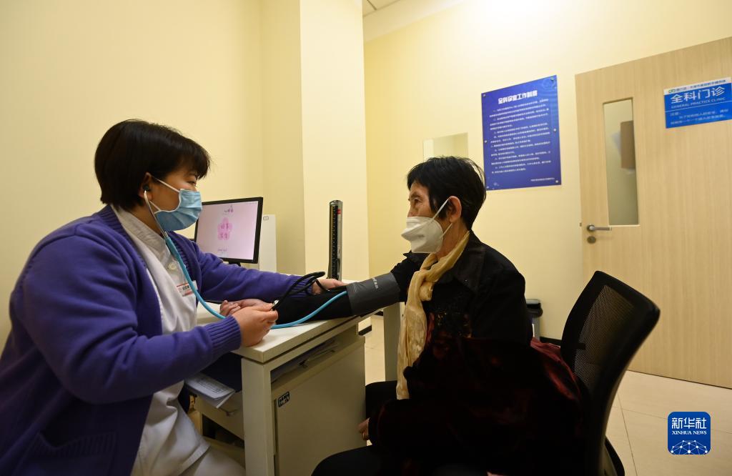 在中新天津生態城第三社區衛生服務中心,醫生在為患者測量血壓(2月24日攝)。