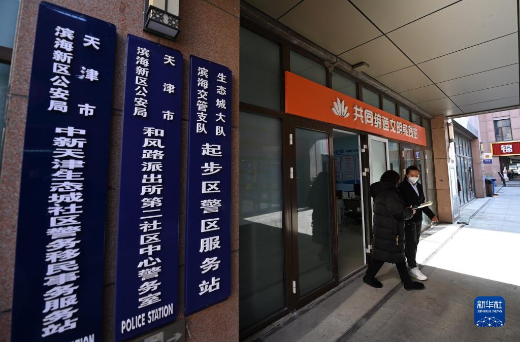 居民在辦理完業務后離開中新天津生態城第二社區中心警務室(2月24日攝)。
