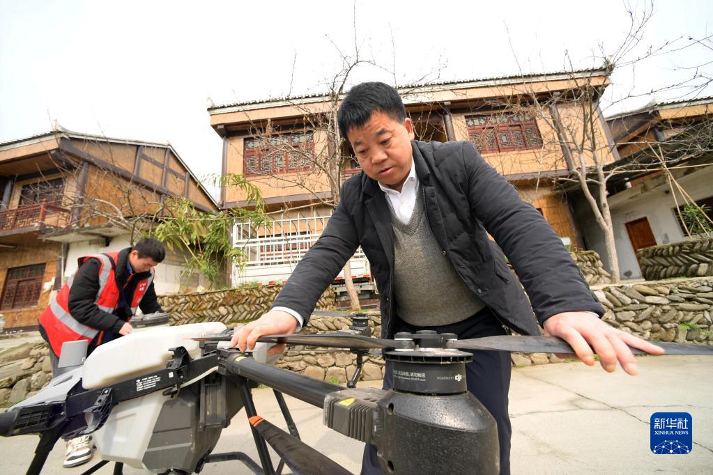 2月25日,農技專家王國書在鳳岡縣新建鎮長磧古寨千畝油菜示范基地組織合作社的工作人員進行植保無人機飛防作業前的準備工作。