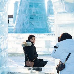 2月25日,游客在哈爾濱冰雪大世界園區留影。