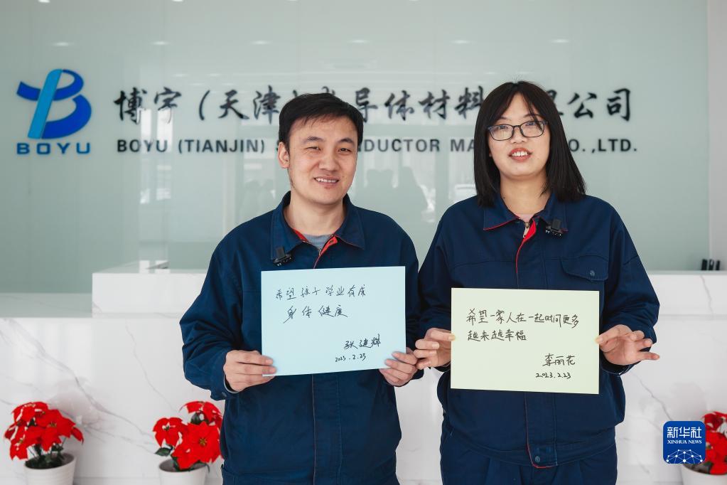 在博宇(天津)半導(dǎo)體材料有限公司,張建輝(左)和李麗花展示他們寫下的心愿(2月23日攝)。“85后”夫妻張建輝和李麗花曾在北京打拼多年,二人目前同在博宇(天津)半導(dǎo)體材料有限公司從事生產(chǎn)工作。2020年,他們落戶天津?qū)氎婢┙蛑嘘P(guān)村科技城,并在配套的中關(guān)村創(chuàng)新人才社區(qū)居住,孩子也從山東老家接來(lái)身邊上學(xué),一家三口實(shí)現(xiàn)了同城生活。張建輝希望孩子學(xué)業(yè)有成、身體健康,李麗花希望一家人在一起的時(shí)間更多、越來(lái)越幸福。