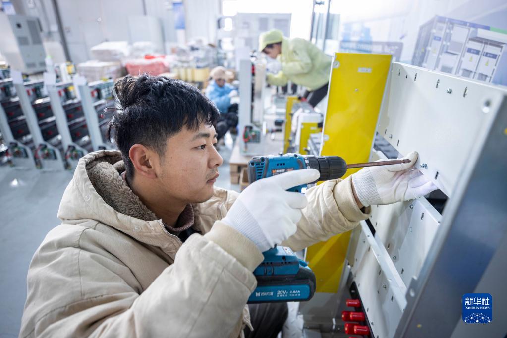 在位于寧夏同心工業園區清潔能源產業園的上能電氣(寧夏)有限公司車間內,工人在加工逆變器所需的配電單元(2月23日攝)。