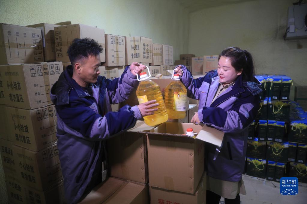 2月20日,在遼寧省朝陽(yáng)市朝陽(yáng)縣木頭城子鎮(zhèn)十家子村,王穎(右)在村里的電子商務(wù)公司倉(cāng)庫(kù)準(zhǔn)備給客戶發(fā)貨。