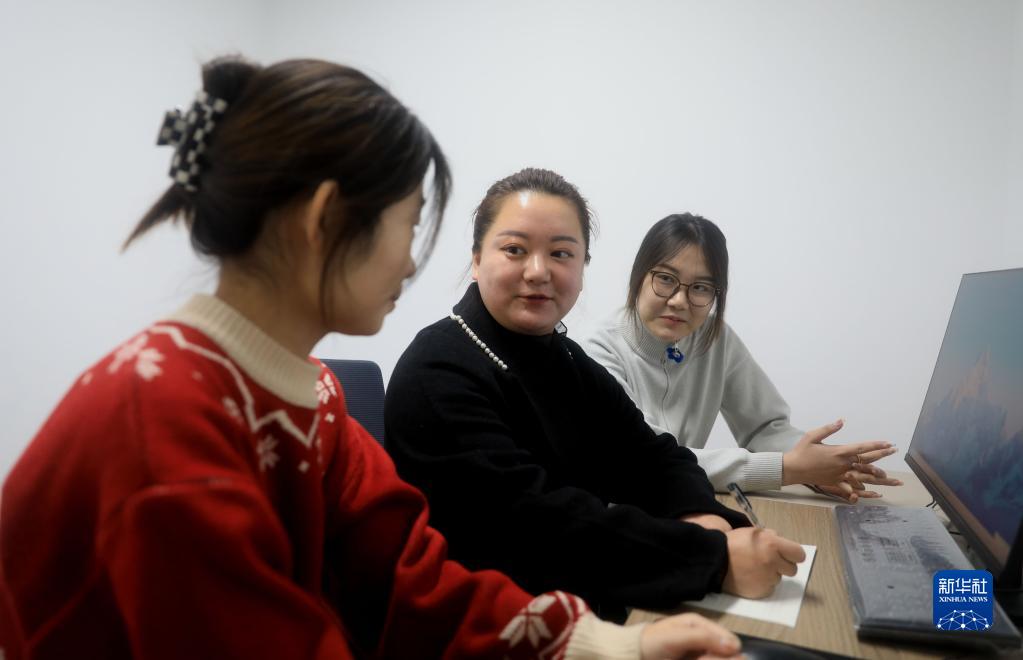 2月21日,在遼寧省朝陽市“村姑進城”實體店,王穎(中)向大學生征求回村工作的建議。
