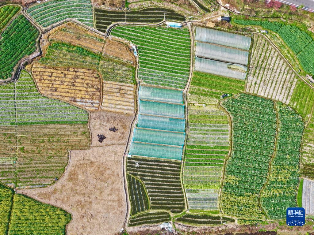 春耕時節,在福建省福州市鄉村山嶺間,一塊塊形狀各異、五彩斑斕的田地猶如大地上的拼圖,呈現別樣的春耕畫卷。