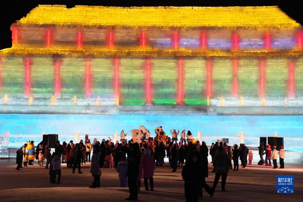 2月25日,游客在哈爾濱冰雪大世界園區游玩。