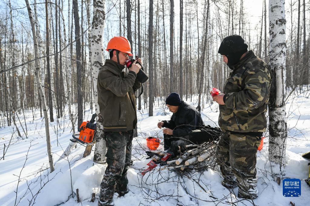 2月23日,烏龍岱林場職工在山林中趁作業(yè)間隙簡單吃點(diǎn)小食當(dāng)午餐。