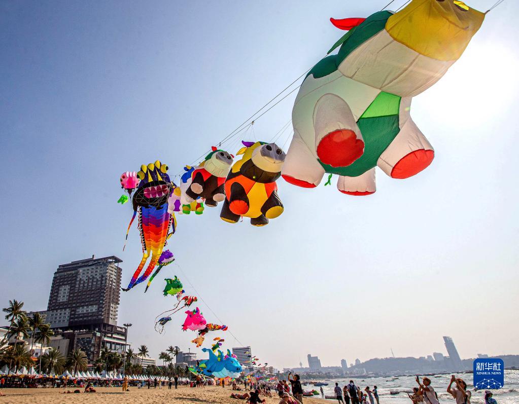 這是2月27日在泰國芭提雅海灘拍攝的大型風箏。泰國芭提雅近日舉辦海灘風箏節。