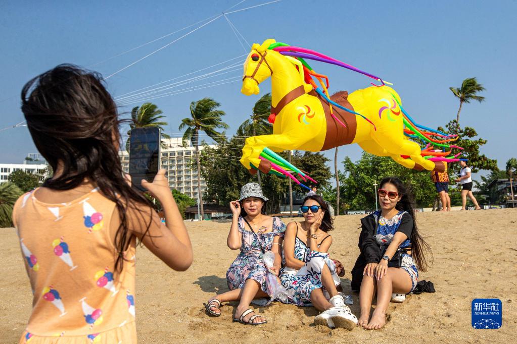 2月27日,游客在泰國芭提雅海灘與風箏合影。泰國芭提雅近日舉辦海灘風箏節。