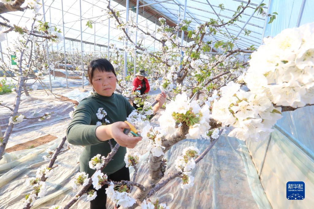 2月27日,山東省棗莊市山亭區(qū)翼云誠信家庭農(nóng)場的果農(nóng)為大棚里的櫻桃花進(jìn)行疏花。