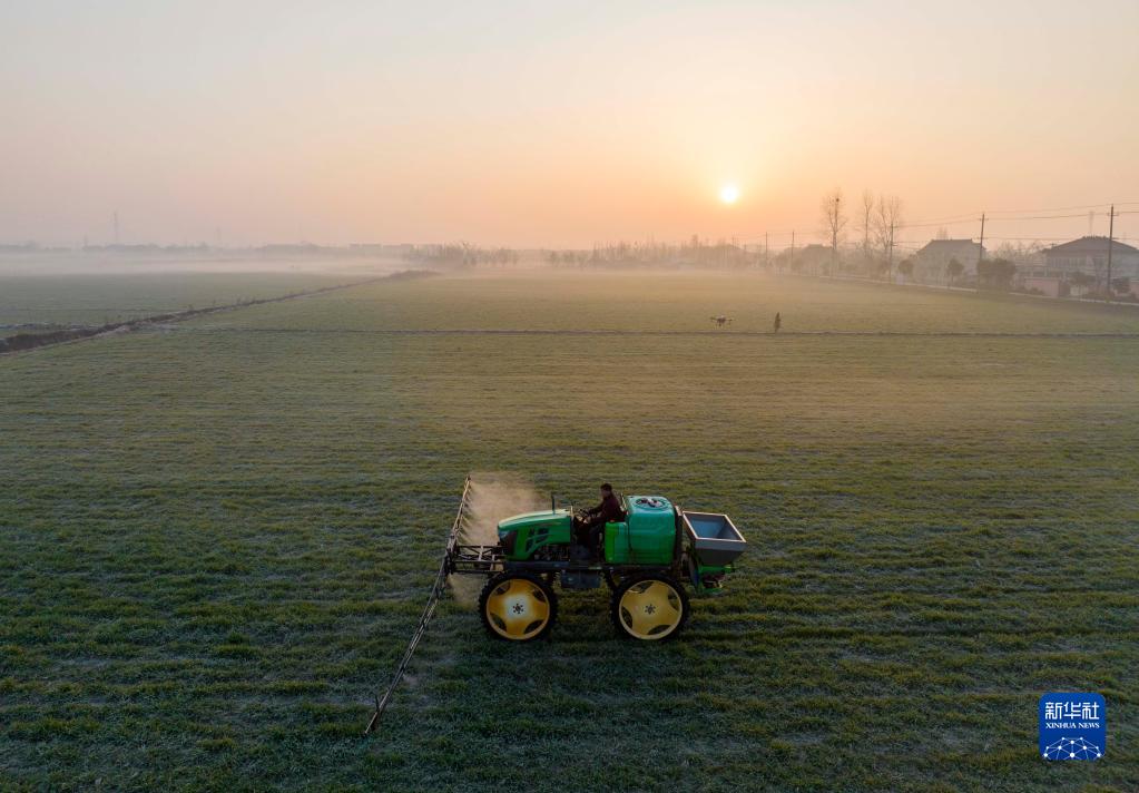 2月28日,在江蘇省泰州市姜堰區顧高鎮塘橋村松青家庭農場小麥田間,農戶駕駛植保機進行噴藥作業(無人機照片)。