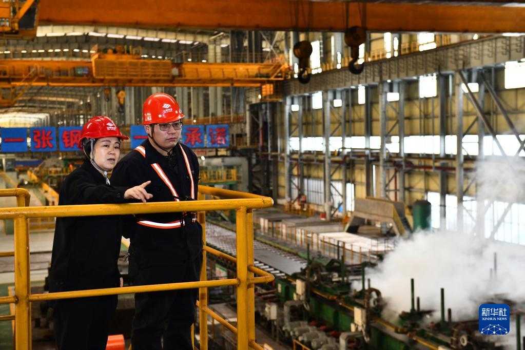 在山鋼集團日照公司生產車間,胡淑娥(左)了解鋼板生產情況(2月16日攝)。
