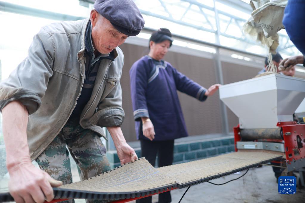 在貴州省榕江縣車江壩區智慧育苗中心內,當地農民運用水稻缽體育秧機、水肥一體自動噴淋機、多功能育苗大棚等機械化、智能化設備進行育秧育苗生產,有效提高了勞動效率和種苗質量,助力春耕生產。