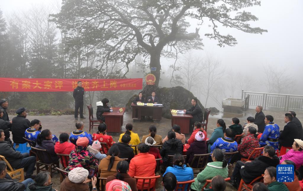2月28日,法庭工作人員在鶴峰縣中營鎮三家臺村開展模擬庭審。