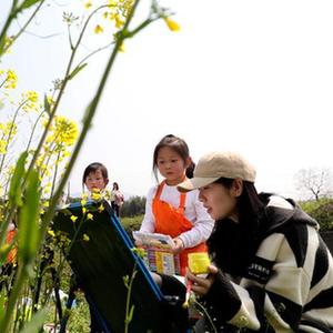 2月28日,在湖南省資興市唐洞街道高碼村,小朋友在油菜花田旁畫畫。