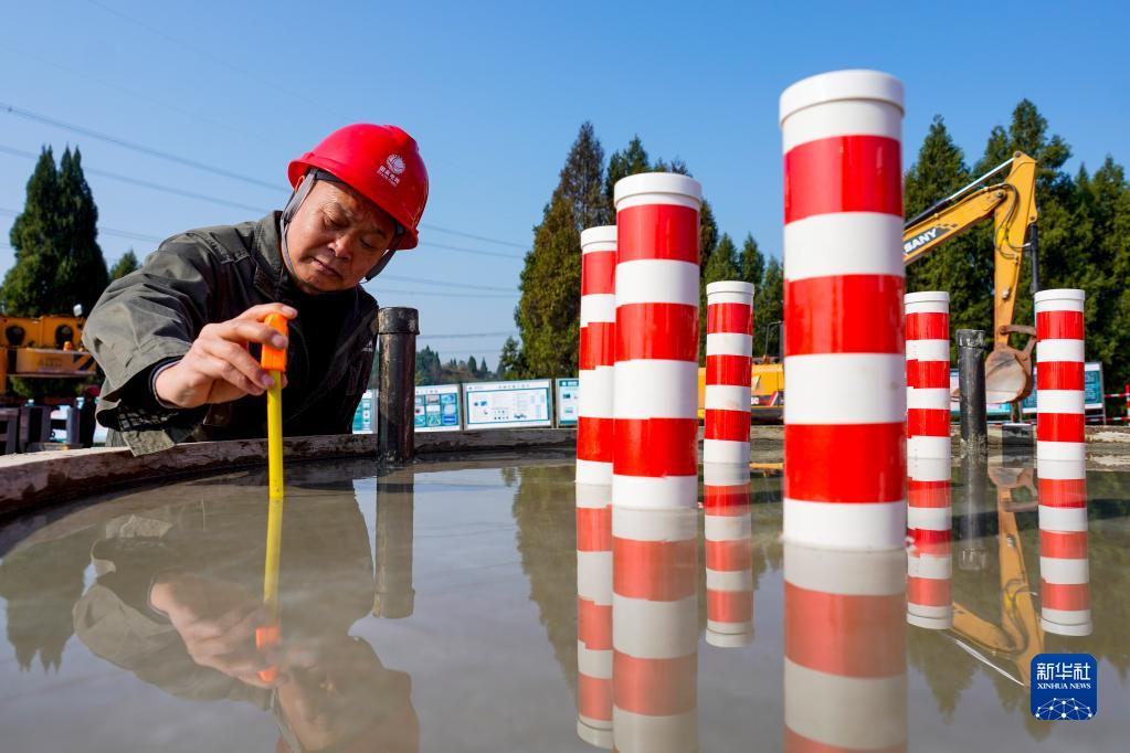 2月26日,在重慶市潼南區(qū)小渡鎮(zhèn)川渝1000千伏特高壓交流工程(重慶段)施工現(xiàn)場(chǎng),工程技術(shù)人員在檢查電力鐵塔基座是否符合技術(shù)標(biāo)準(zhǔn)。