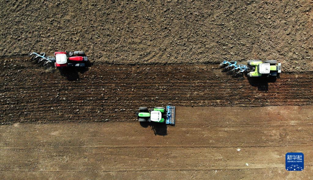 在萊西市夏格莊鎮(zhèn)曲家泊南村農(nóng)田里,安裝了北斗精準(zhǔn)定位輔助系統(tǒng)的拖拉機(jī)在進(jìn)行翻整協(xié)同(翻地、整地同時(shí)進(jìn)行)作業(yè)(2月28日,無人機(jī)照片)。