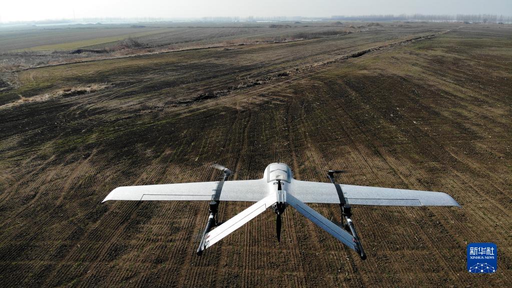 在萊西市夏格莊鎮(zhèn)數(shù)字農(nóng)業(yè)產(chǎn)業(yè)園內(nèi),固定翼無人機(jī)在進(jìn)行土地航測,可實(shí)現(xiàn)地塊精準(zhǔn)掃描制圖、多光譜掃描病蟲害等功能,結(jié)合后臺數(shù)據(jù)信息平臺為農(nóng)業(yè)生產(chǎn)提供數(shù)據(jù)支持和決策依據(jù)(2月28日,無人機(jī)照片)。