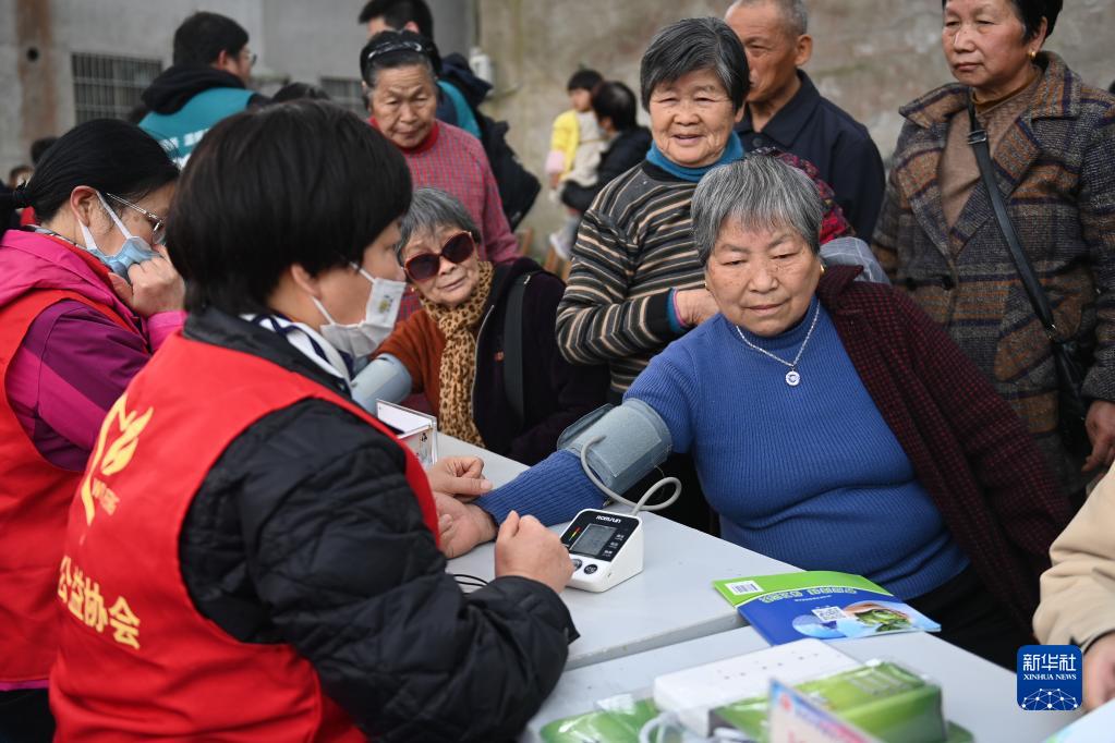 3月1日,志愿者在寧波市奉化區(qū)錦屏街道城西岙村為村民測量血壓。