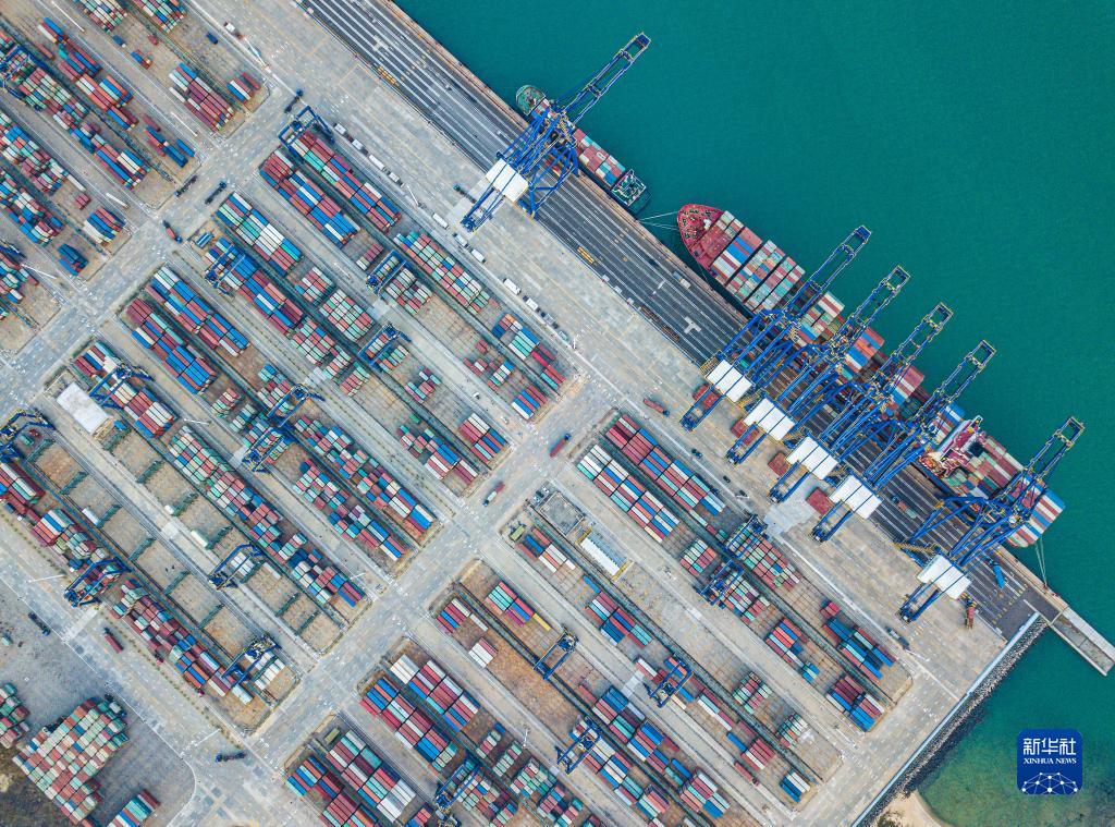 在環(huán)新英灣地區(qū)拍攝的洋浦國(guó)際集裝箱碼頭(無人機(jī)照片,2月28日)。