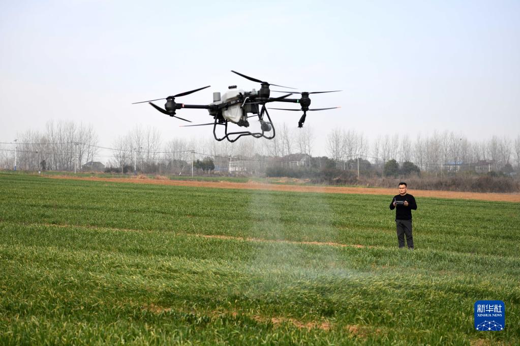 2月28日,王昌在來安縣水口鎮(zhèn)擁巷村操作植保無人機噴灑除草劑。