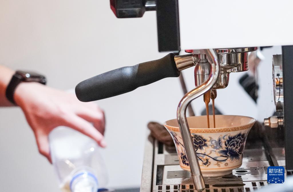在位于北京大柵欄的內聯升“大內·宮?!笨Х葟d,工作人員用中式茶杯承裝濃縮咖啡(2月18日攝)。