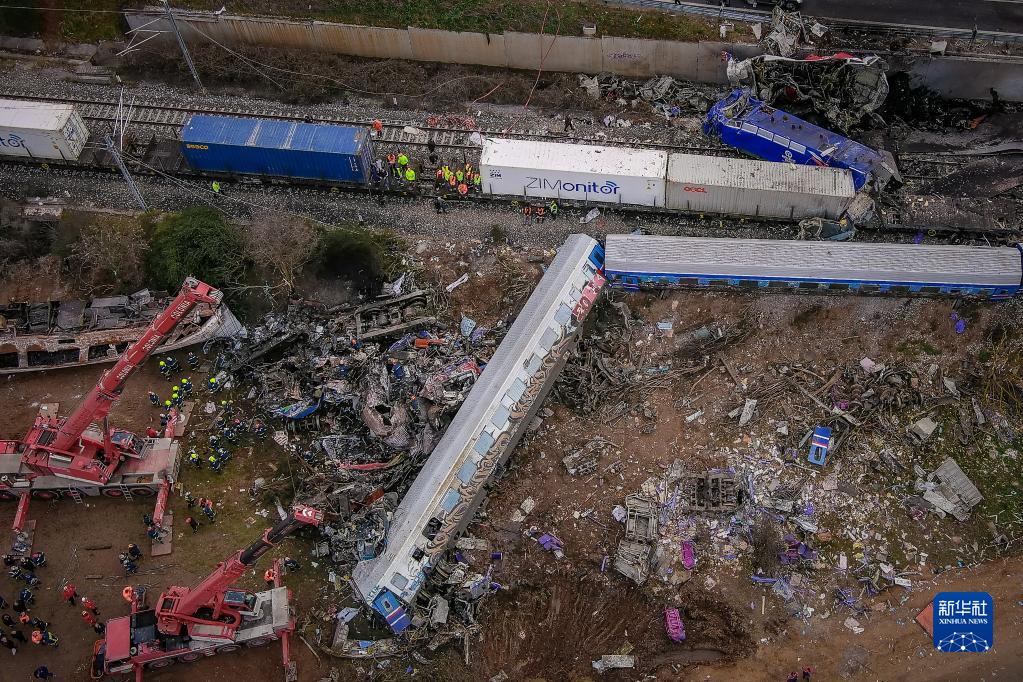 這是3月1日在希臘中部城市拉里薩市附近拍攝的火車相撞事故現(xiàn)場(無人機照片)。