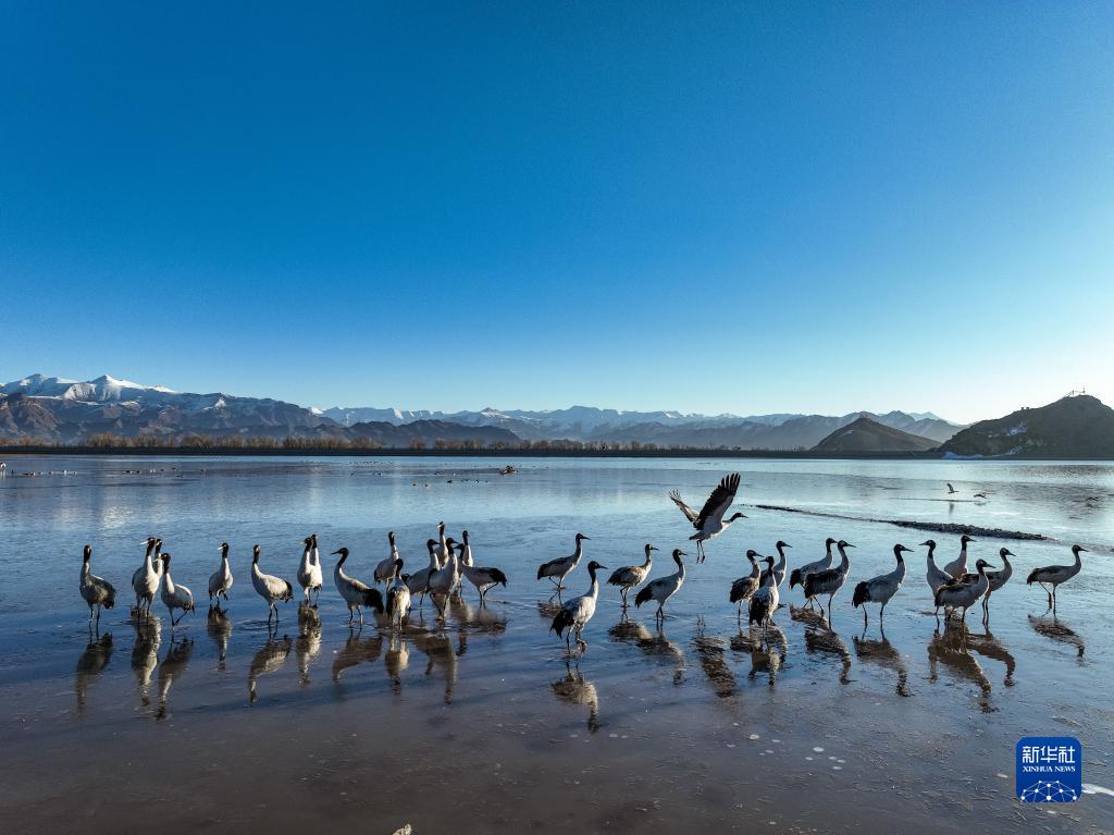 拉薩市林周縣卡孜水庫拍攝的黑頸鶴(3月1日攝,無人機照片)。