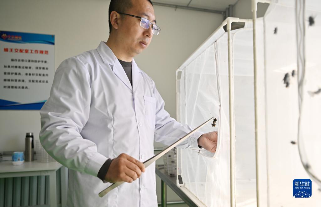 在中農熊蜂繁育基地,工作人員從交配籠中將交尾的蜂王夾出(3月1日攝)。