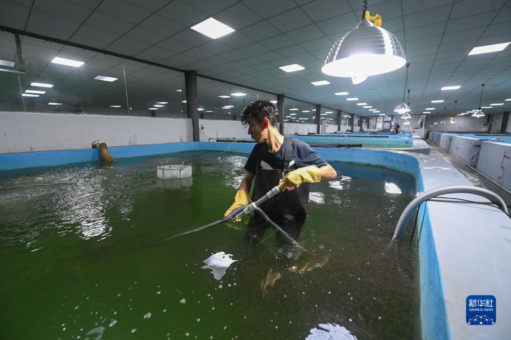 3月2日,在位于湖州市吳興區(qū)東林鎮(zhèn)保健村的湖旺水產(chǎn)基地的恒溫繁育車(chē)間內(nèi),工作人員在進(jìn)行人工吸污并查看水池中鱸魚(yú)魚(yú)苗的生長(zhǎng)情況。該水產(chǎn)基地460畝育苗池塘配套著恒溫設(shè)備,數(shù)字化繁育車(chē)間每日能孵化出2000萬(wàn)尾魚(yú)苗,供給周邊的漁業(yè)養(yǎng)殖戶。