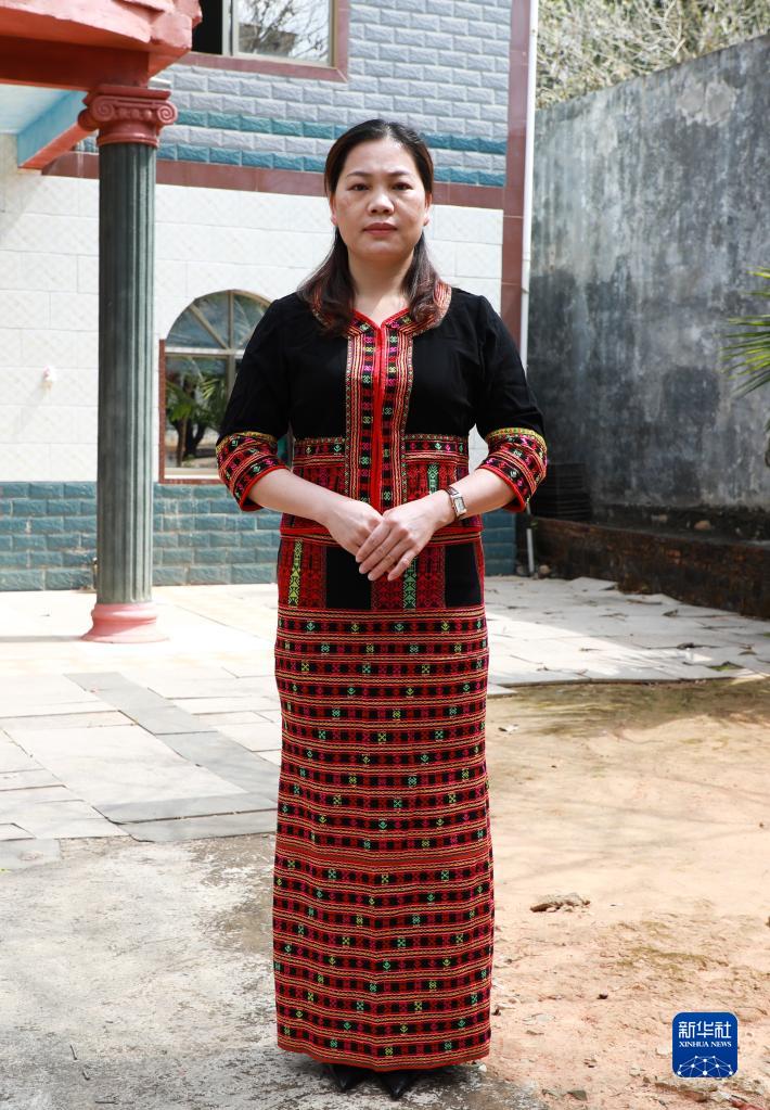 韋小麗身著黎族服飾在海南省白沙黎族自治縣七坊鎮長龍村(2月23日攝)。