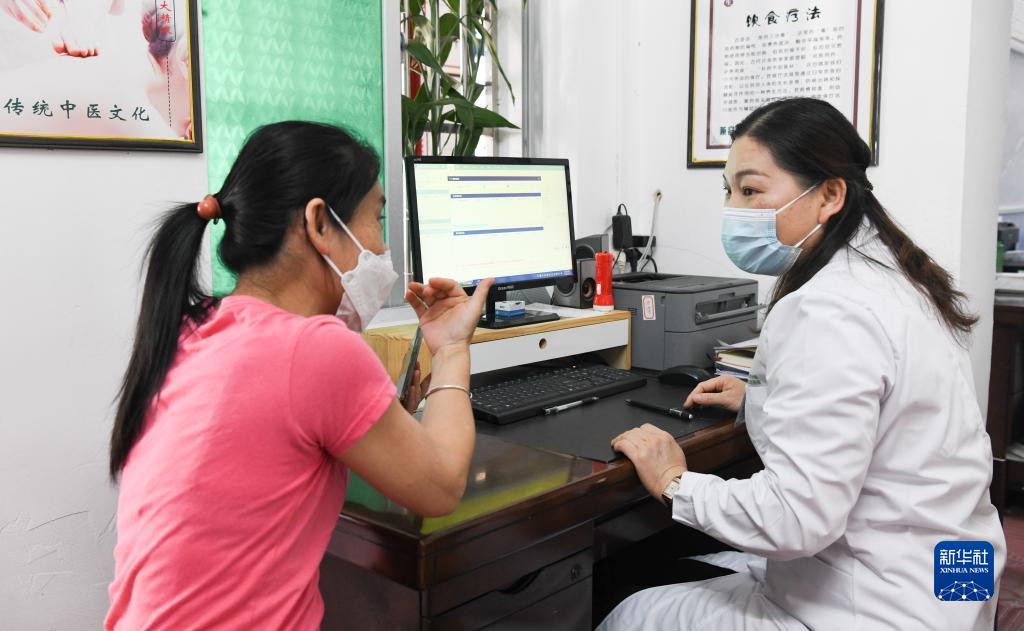 在海南省白沙黎族自治縣七坊鎮社區醫院,韋小麗(右)在為病人問診(2月13日攝)。