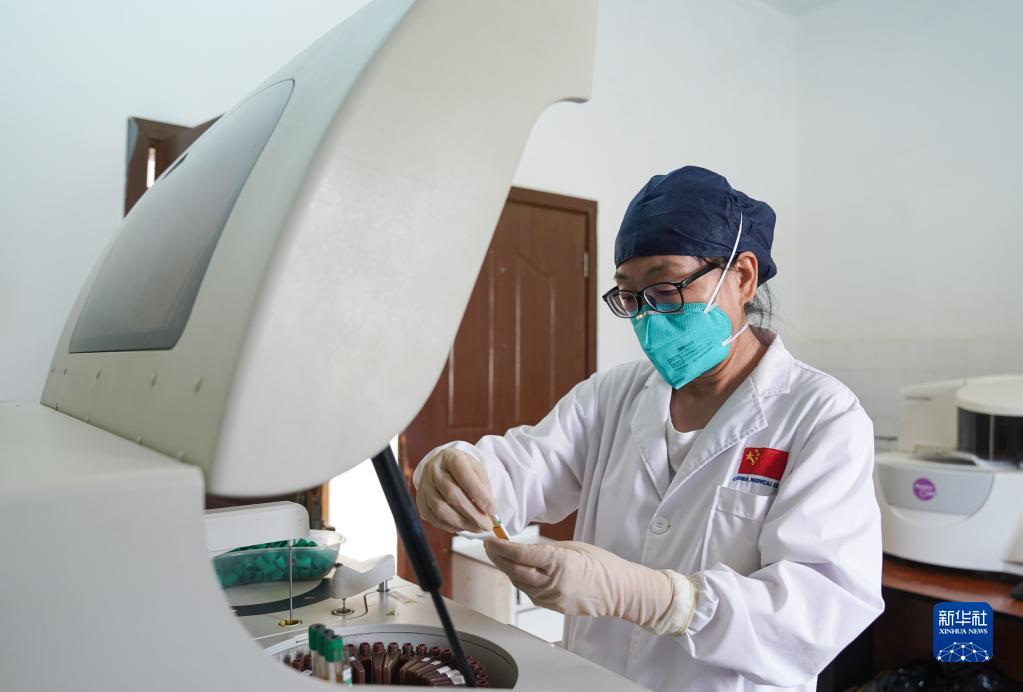 2月28日,在吉布提首都吉布提市貝爾蒂耶醫(yī)院,中國第21批援吉布提醫(yī)療隊醫(yī)生韓俊英檢驗血液樣本。