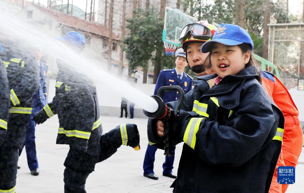 3月3日,在長寧消防救援支隊(duì)訓(xùn)練場,“小小消防志愿者”服務(wù)隊(duì)隊(duì)員在消防員輔助下體驗(yàn)水槍噴射。