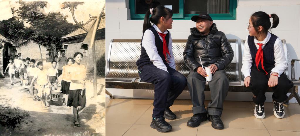 左圖:上世紀60年代,金沙小學五(2)雷鋒中隊隊員幫助軍烈屬打水(新華社發);右圖:2月24日,金沙小學學生們和當地敬老院老人聊天(新華社記者 季春鵬 攝)(拼版照片)。