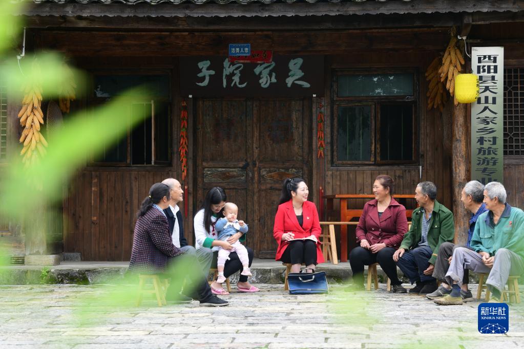 全國人大代表、重慶酉陽土家族苗族自治縣桃花源街道天山堡村黨支部書記、村委會主任冉慧(右五)在調(diào)研鄉(xiāng)村旅游發(fā)展情況(2020年5月15日攝)。