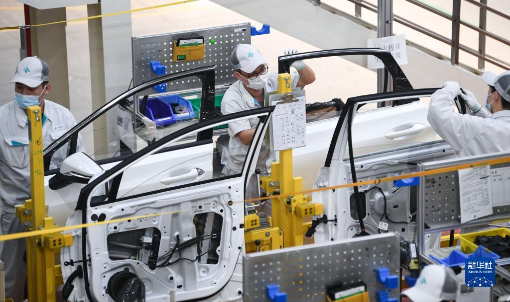 在廣州市番禺區的廣汽埃安新能源汽車股份有限公司總裝車間,工人在安裝車門密封膠條(2月24日攝)。