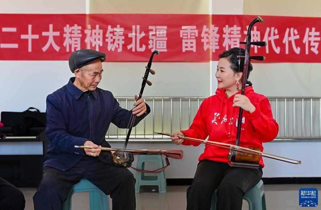 3月3日,在二連浩特市格日勒敖都蘇木賽烏素嘎查文化室,文藝志愿者蔡霞(右)為二胡音樂愛好者傳授演奏技藝。