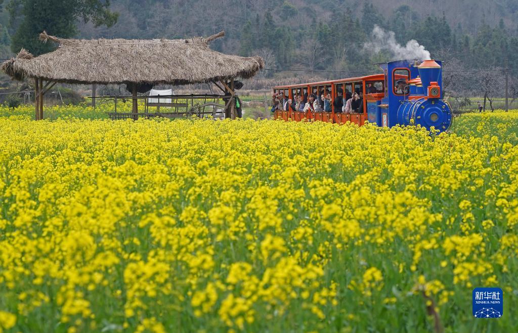 游客在江西省婺源縣嚴田景區(qū)乘坐“小火車”觀賞花海(3月3日攝)。