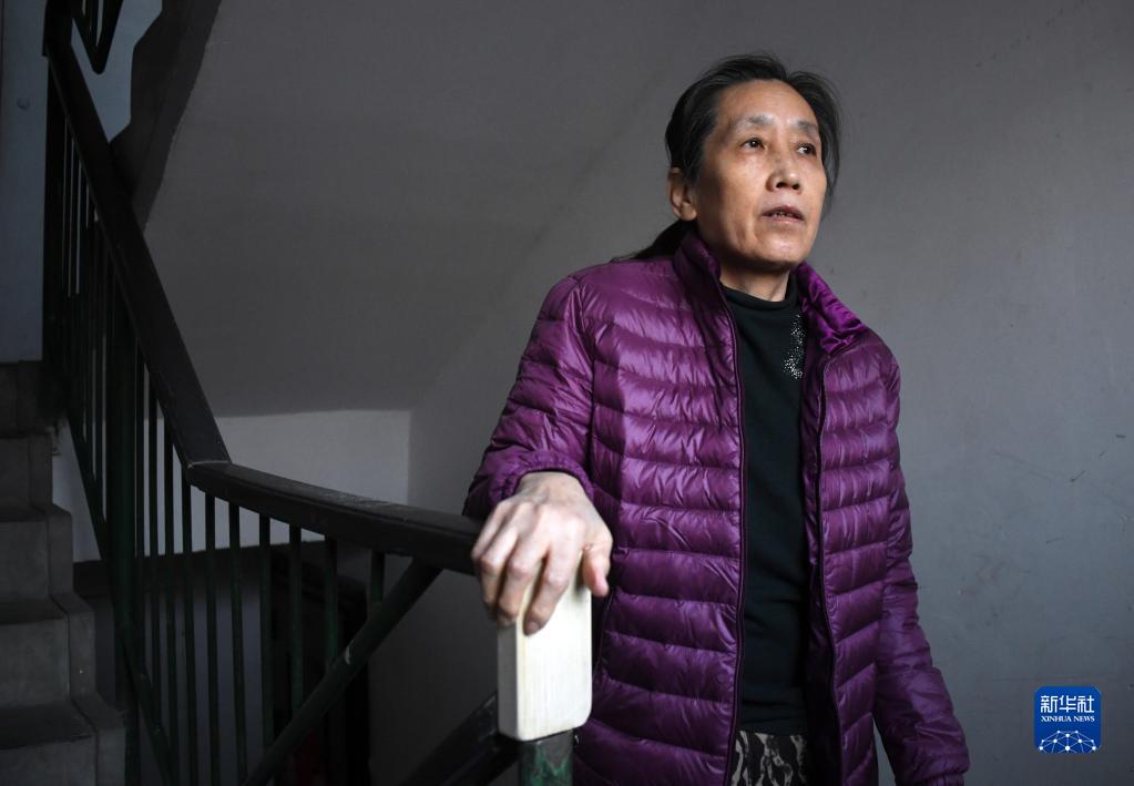 3月4日,在北京市順義區旺泉街道宏城花園社區一座居民樓內,社區居民扶著修復好的扶手上樓。